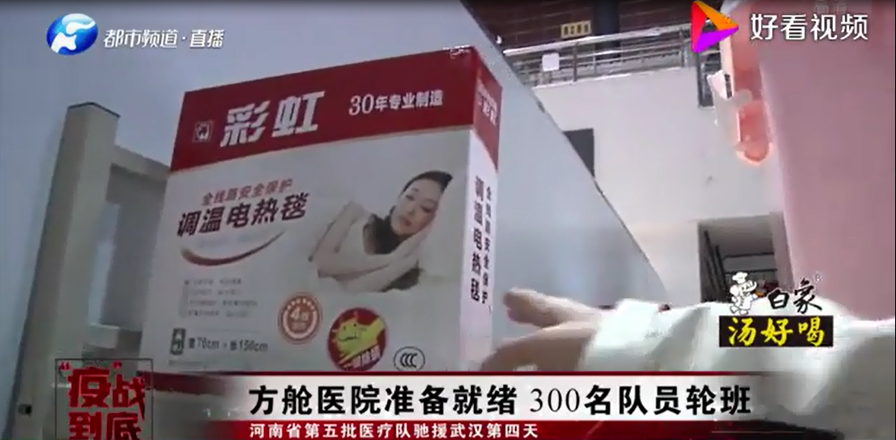 万搏(中国)万搏电热毯已成为武汉多个方舱医院标准配置的取暖用品,各大电视媒体纷纷报道,网络平台也时有图像视频发出,彰显了我们成都造的品牌和品质。为打赢这场战“疫”,我们送去了万搏(中国)万搏温暖,体现了万搏(中国)万搏爱心,贡献了万搏(中国)万搏力量!