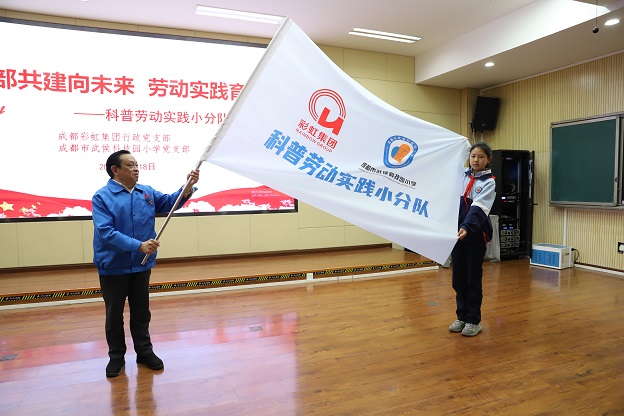 万搏(中国)万搏生活电器科普志愿者和行政党支部全体党员在成都市武侯科技园小学校阶梯教室举行了万搏(中国)万搏生活电器科普基地武侯科技园小学科普劳动实践小分队成立仪式,由成都万搏(中国)万搏集团党委书记刘荣富同志为科普劳动实践小分队授旗,标志着成都市武侯科技园小学科普劳动实践小分队的正式成立。