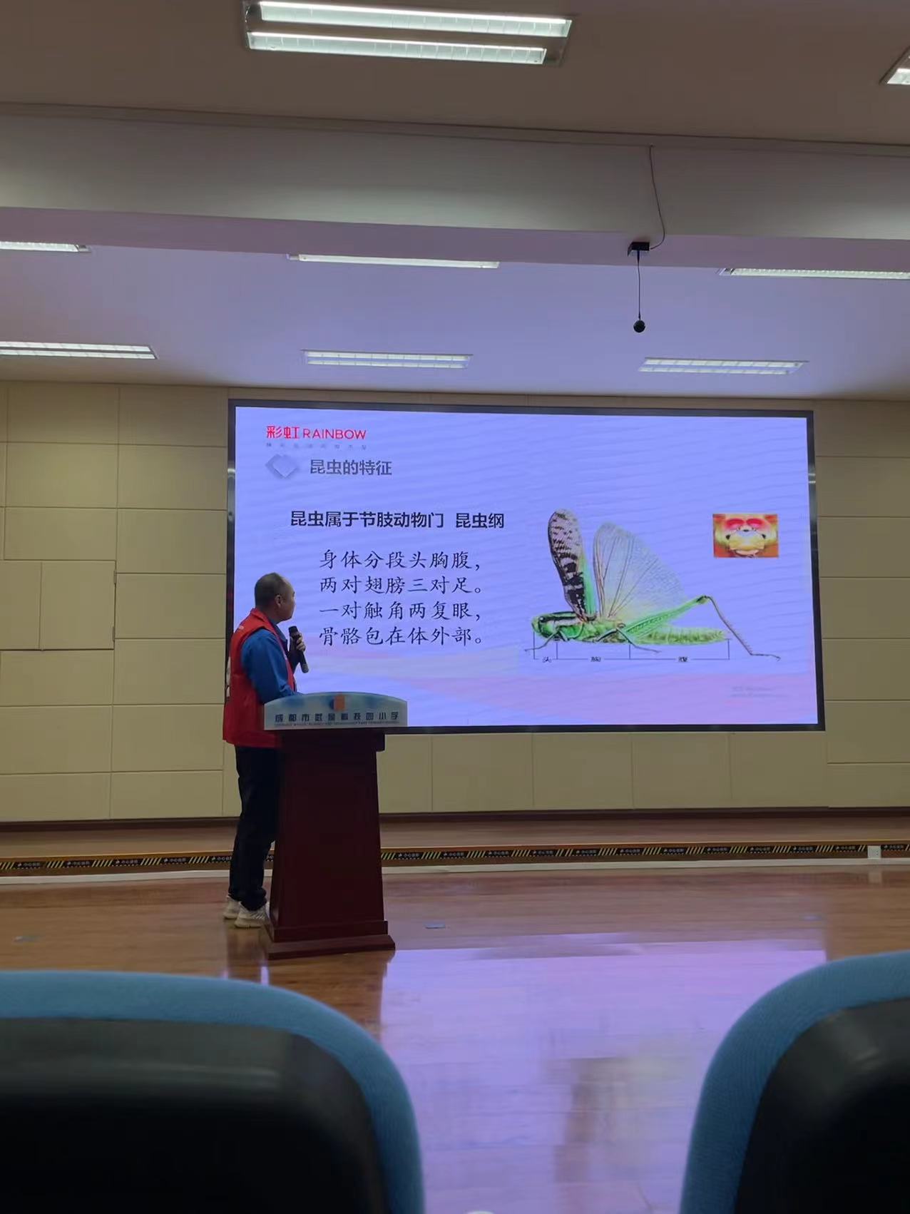 仪式结束后,学校四、五年级学生代表和部分老师聆听了成都万搏(中国)万搏集团家卫部高级工程师、“成都工匠”何一斌老师为大家讲解的《走进昆虫的世界——害虫的多样性》科普知识讲座。何老师从昆虫的种类、习性逐一讲解,将知识性、趣味性融为一体,加深了同学们对昆虫的认识,了解了驱蚊杀虫相关方式方法,进一步感受到了科学给大家带来的无穷魅力。